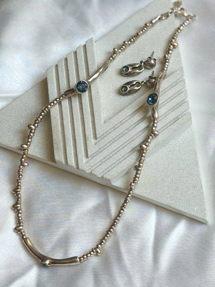 🪙 Этот комплект — воплощение природной силы и индустриального стиля. Колье и серьги со вставками из глубоких синих кристаллов напоминают застывшую морскую стихию. Лаконичные формы и холодный блеск делают их идеальным выбором для тех, кто ищет небанальную классику в авторском исполнении. Такие украшения лучше всего работают с нейтральной палитрой. Наденьте их с серым оверсайз-свитером, белой базовой футболкой или классическим черным жакетом. Холодный блеск металла и яркие искры кристаллов моментально превратят простой будничный наряд в стильный и завершенный образ.👌 ✨Нажмите для заказа ✉️ Нажмите чтобы задать вопрос