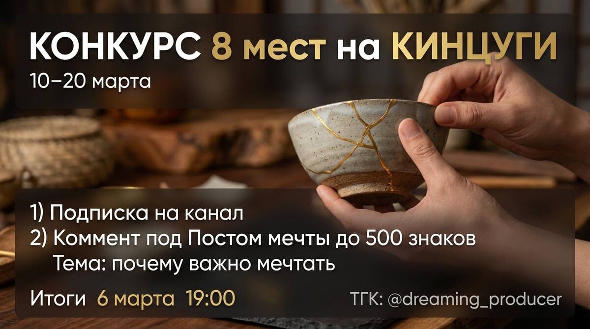 ) Хочу дать подписчикам 8 мест на мастер класс по кинцуги. Попасть можно через конкурс. Условия участия 1. Быть подписанным на канал. 2. Под Постом мечты написать https://t.me/dreaming_producer/56 один комментарий до 500 знаков на тему: почему важно мечтать. По желанию 3) Сделать репост этого конкурса к себе в сторис. Как выберу победителей – 4 участника – чьи комментарии под Постом мечты наберут больше всего реакций. – 4 участника – выберу сам по смыслу и подаче. Итоги 6 марта в 19:00 опубликую победителей тут на канале отдельным постом.