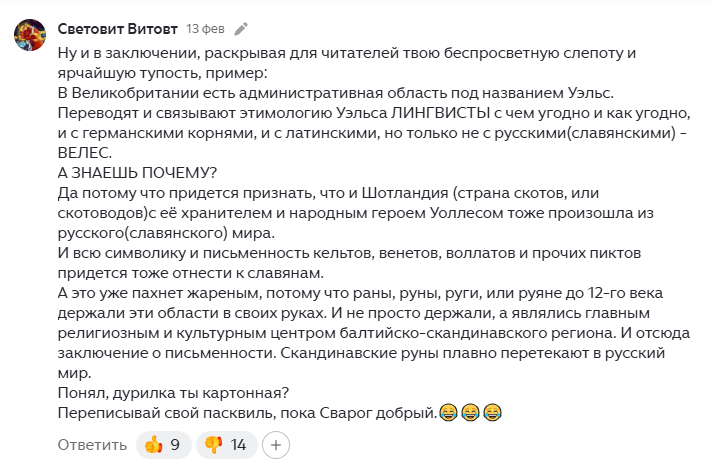 Световит явно уверен в том, что если родство кельтских, германских и скандинавских наречий с древнеславянскими будет признано, то это будет политическая победа для России. Видимо, Британия на пару с ЕС тут же обязаны будут отдать РФ и Прибалтику, и Шотландию, и много чего еще. Ведь тысячу лет назад руги контролировали балтийско-скандинавский регион!