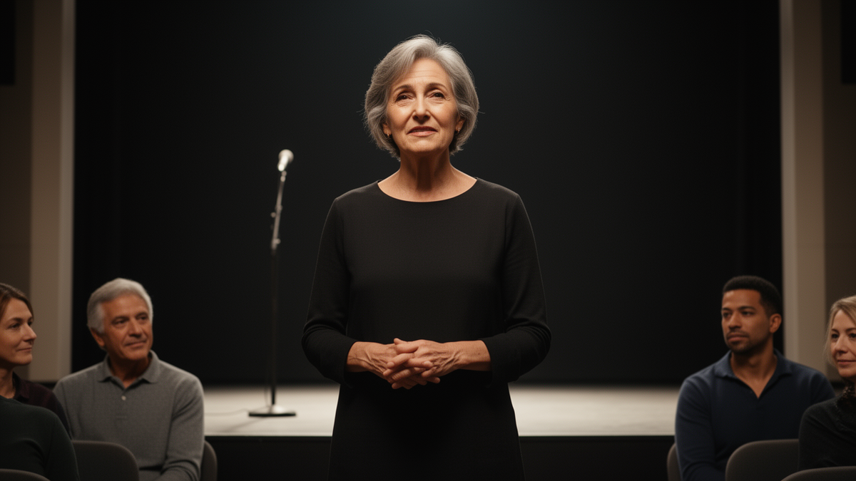 В зале было около пятидесяти человек. Небольшая сцена, чёрный занавес, два прожектора, от которых свет резал глаза. Микрофон стоял посередине. Нина вышла на край кулисы, посмотрела на зал и сразу пожалела. Лица сливались, но она различила пару знакомых: муж сидел ближе к проходу, рядом с ним — сын, неожиданно пришедший, и это ударило по ней волной нежности и паники.
