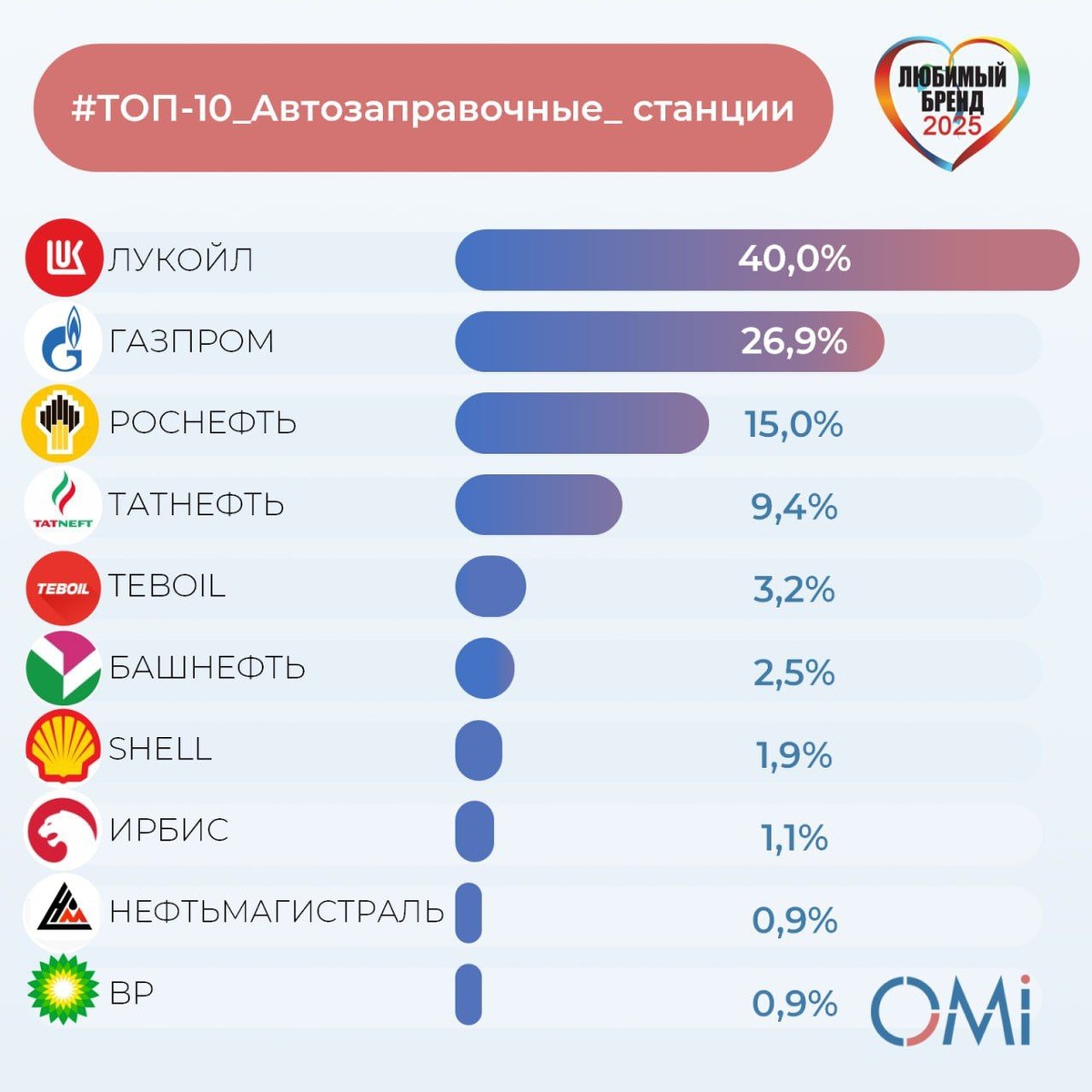Категория показывает ежегодную стабильность. Первые семь мест десятки без изменений с предыдущего года: Лукойл, Газпромнефть, Роснефть, Татнефть, Teboil, Башнефть и SHELL (соответственно). После года отсутствия в десятку вернулся бренд IRBIS и занял восьмую строчку. На девятом месте новичок прошлого года - Нефтьмагистраль. Завершает десятку TNK BP. 📈 Тенденции рынков - подписаться