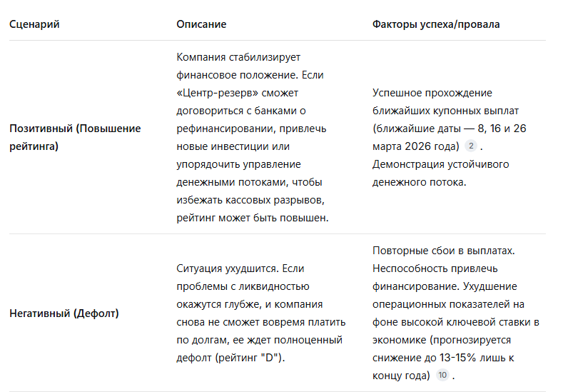 ИИ. Исходя из актуальных данных, финансовый прогноз для компании «Центр-резерв» на 2026 год является крайне неопределенным и несет в себе высокие риски. Ключевое событие уже произошло: компания допустила технический дефолт, и рейтинг был понижен до преддефолтного уровня "C". Дальнейшее развитие событий будет зависеть от способности компании исправить ситуацию с ликвидностью.