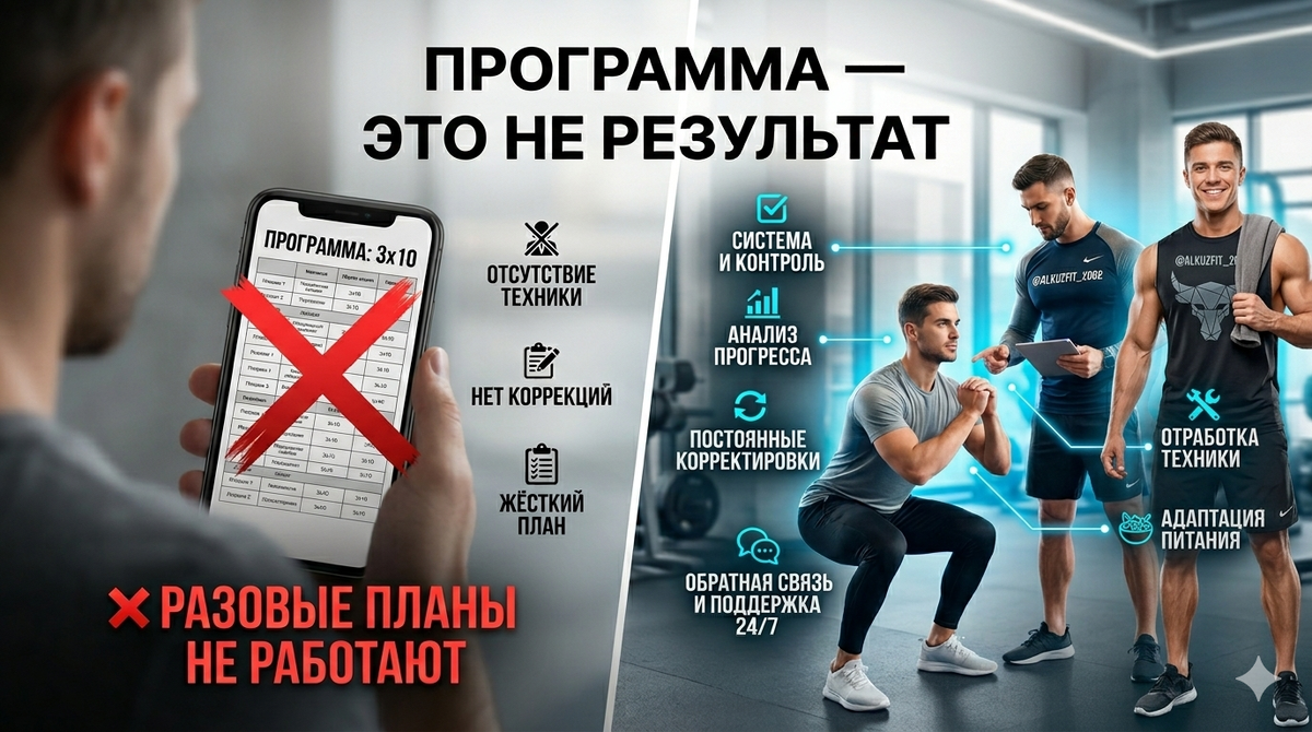 Я веду людей до результата, а не продаю PDF с «3×10» и списком продуктов. Если ты реально готов работать, а не создавать иллюзию работы — нам по пути.
