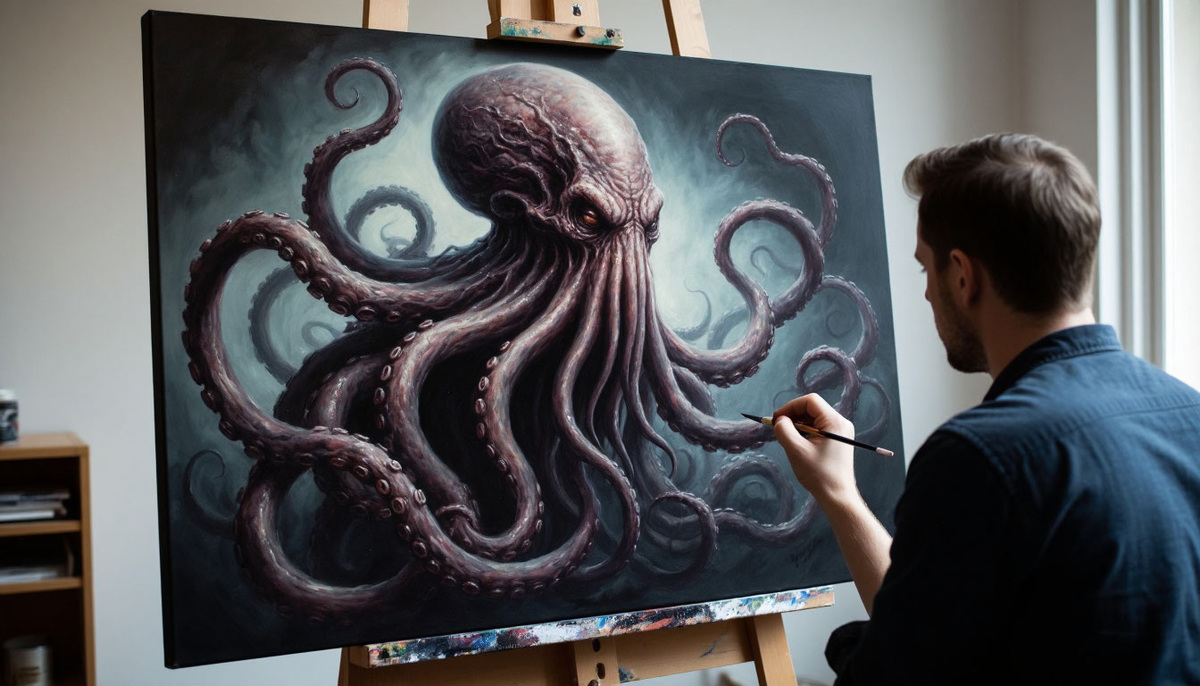К субботе картина была завершена. Чудовище заполнило весь холст. Оно не просто было изображено — оно существовало там, за гранью реальности. Его глаза, казалось, смотрели прямо на Марка, проникая в самые глубины его души. Щупальца начали медленно двигаться, словно пытаясь прорваться сквозь холст. Воздух наполнился запахом озона и чего‑то ещё — древнего, чуждого, от чего волосы на затылке вставали дыбом, а в ушах застучала кровь. Марк ощутил, что его собственное дыхание стало прерывистым, а сердце колотится так сильно, что готово вырваться из груди.