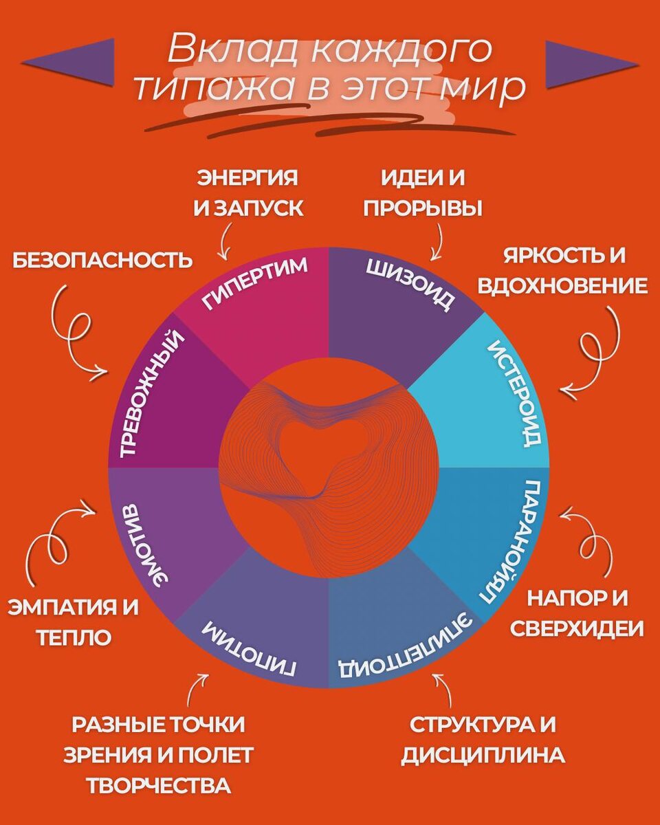 Каждый из них написан своим характером. И у каждого - своя миссия. 🧡 Гипертим Человек с вечно «включенной» батарейкой. Пока другие думают - он делает. НЕ важно как, просто быстро. чаще за ним надо поправлять. Его вклад - энергия и запуск. Он зажигает проекты, ведёт за собой и не даёт миру застояться. 🧡 Гипотим Всегда в ощущениях - что происходит , что еще нужно, чтобы достичь ускользающего равновесия, гармонии и частья. Это человек-экспериментатор! Да, он живет на пониженной передаче, но видит (вернее, ощущает, обоняет, осязает..) то, что не видят другие. Его вклад - разные точки зрения и полет творчества. Он видит невидимое, тонкий и хрупкий инструмент. 🧡 Эмотив Ходячее сердце и обнимашки с улыбкой. Его вклад - эмпатия и тепло. Он создаёт уют, поддерживает в трудную минуту и напоминает, что мир держится на чувствах. 🧡 Шизоид Живёт в своей вселенной. Его вклад - идеи и прорывы. Именно он придумывает то, что остальным кажется странным, а потом меняет мир. Благодаря Шизоидам все откр