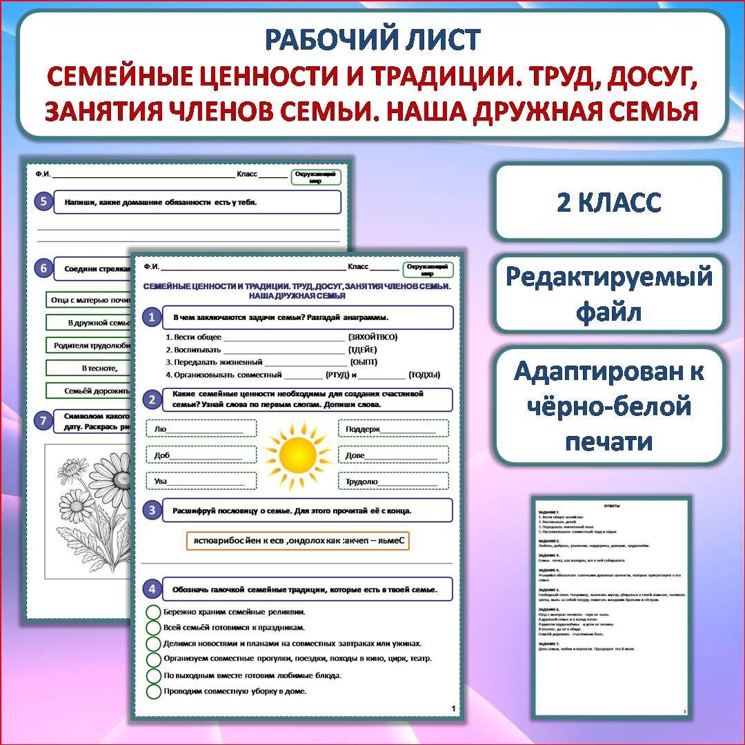 Рабочий лист скачать здесь Филворд "Семейные ценности" скачать здесь Презентацию к уроку скачать здесь Рабочий лист «Семейные ценности и традиции. Труд, досуг, занятия членов семьи. Наша дружная семья» разработан к уроку окружающего мира во 2 классе. Данная разработка станет хорошим сопровождением не только для урока, но и для классного часа или внеклассного мероприятия со схожей тематикой. Рабочий лист состоит из семи заданий, расположенных на двух листах. На третьем листе даны ответы. Цель - создание условий для формирования понятий о семейных ценностях и традициях семьи. Задания рабочего листа разнообразны и интересны, они помогают развивать интерес к предмету, самостоятельность, умение анализировать информацию и делать выводы. Также способствуют осознанию личностной ответственности за свои поступки, в том числе по отношению к членам своей семьи. Данная разработка станет ценным помощником для учителя начальных классов. Она облегчит усвоение темы и тем самым обеспечит эффективное про