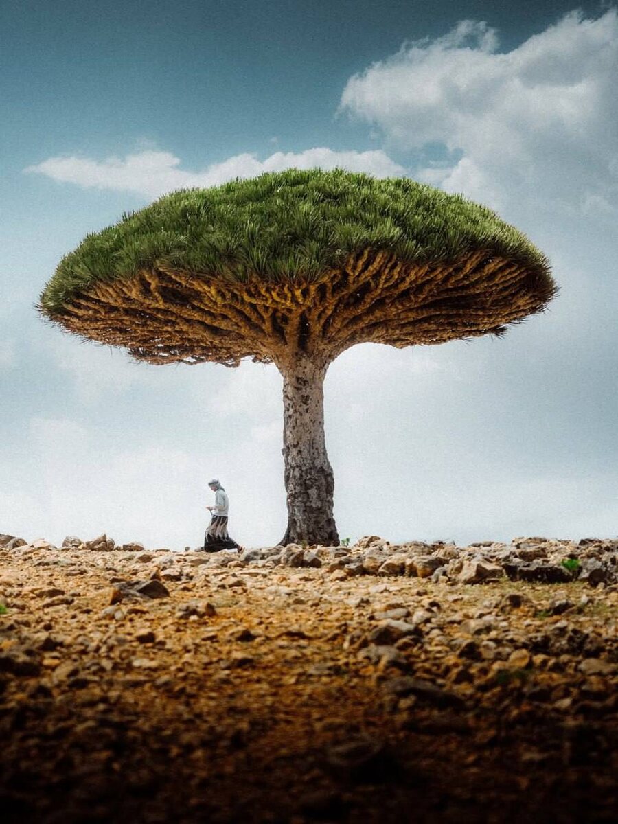На острове Сокотра в Йемене можно увидеть уникальные пейзажи: белые песчаные дюны, бескрайний океан и редкие драценовые рощи