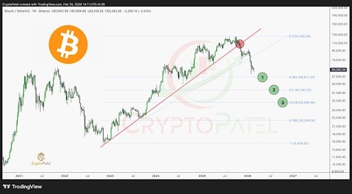 📉 Криптоаналитик Crypto Patel предполагает, что Биткойн официально вошел в медвежью зону, пробив долгосрочный уровень поддержки в $107 000. Этот технический анализ на основе недельного графика предсказывает дальнейшую коррекцию до $35 000 к 2026 году. 📊 Ключевые моменты: - Пробой ниже $107 000 сигнализирует о смене тренда. - Прогноз основан на уровнях коррекции Фибоначчи. - Целевые уровни поддержки: $44 000 (0.5 Фибоначчи) и $35 000 (0.618 Фибоначчи). - Исторически глубокие коррекции (~84% в 2018, ~77% в 2022) предшествовали новым ралли. ⚠️ Риски: Долгосрочная нисходящая тенденция с потенциальным снижением до $35 000. Горизонт: Среднесрочно