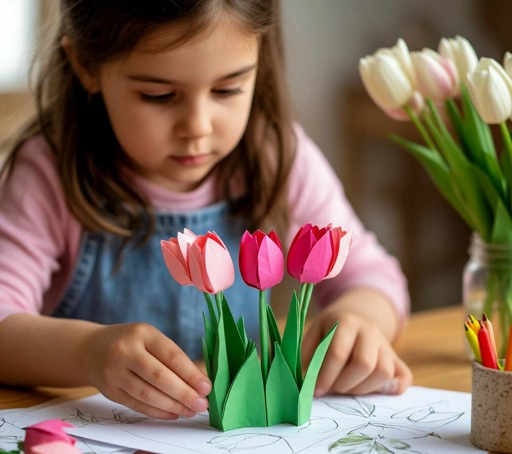Запах клея и цветной бумаги — вот он, главный запах моего детства накануне 8 марта. Мы сидели за партами, низко склонив головы, вырезали неуклюжие тюльпаны из красной бумаги, которая вечно пачкала пальцы. Лепестки получались кривыми, один вечно больше другого, но мы старательно их загибали, чтобы цветок стал объёмным. Стебельки из зелёных полосок, которые вечно норовили раскрутиться обратно в трубочку.