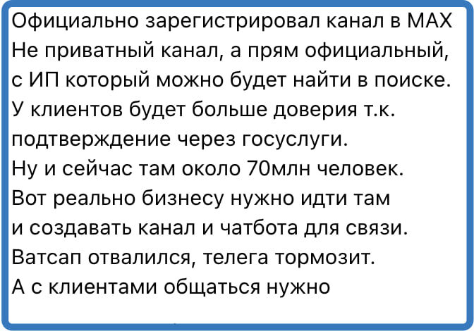 ? :) Ну в общем не вижу проблем - если это будет работать, то лично мне пофигу. Но Максу (мессенджеру) потребуется еще 2-3 года, чтобы догнать текущий функционал Телеграмма. Русский ИТ бизнес +✅Мы в MAX