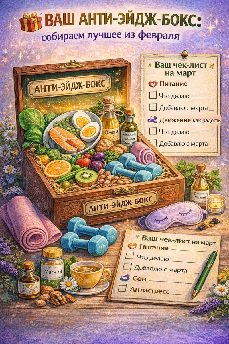 Февраль подходит к концу. Мы говорили о жирах и коллагене, об антиоксидантах и движении, о сне и стрессе. А теперь давайте соберём вашу личную шкатулку молодости — простые, но мощные привычки, которые реально работают. 📦 Что положить в свой анти-эйдж-бокс? 🧴 УХОД ИЗНУТРИ: Коллагеновая тарелка: белок + витамин С + цинк (яйца, рыба, цитрусовые, зелень, тыквенные семечки). Жиры-союзники: ложка льняного масла в день, оливковое в салаты, горсть орехов на перекус. Цветная защита: каждый день 3 разных цвета овощей/фруктов (красный, фиолетовый, зелёный — для антиоксидантной армии). 💪 ДВИЖЕНИЕ КАК РАДОСТЬ: Найдите то, что приносит удовольствие: танцы, прогулки, йога, плавание. 2 раза в неделю — силовые (хотя бы приседания и отжимания от стены), чтобы сохранить мышцы. Двигайтесь в течение дня, не сидите дольше часа без перерыва. 😴 ВОССТАНОВЛЕНИЕ: Сон 7-8 часов с режимом (ложимся и встаём в одно время). Ритуал отхода ко сну: проветривание, тёплая ванна, травяной чай, книга вместо т