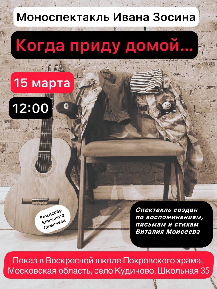 !💙 В воскресенье, 15 марта 2026, в 12:00 в актовом зале Воскресной школы при Покровском храме села Кудиново состоится моноспектакль Ивана Зосина «Когда приду домой». Документальный моноспектакль — посвящение Виталию Моисееву — герою СВО, воплощенное актером Иваном Зосином (Театр на Таганке, 2007–2015; ветеран Чечни). Это воображаемая встреча двух судеб после гибели одного. Зритель познакомится с личными историями Иван Зосина, его песнями из альбома «Капитан», написанного после поездки на СВО, стихами и письмами Виталия Моисеева. 🎬Режиссер-постановщик: Елизавета Семичева 🎬Артист и автор песен: Иван Зосин 🎬Искусство и культура, 12+ Вход свободный. #покровскийхрамкудиново