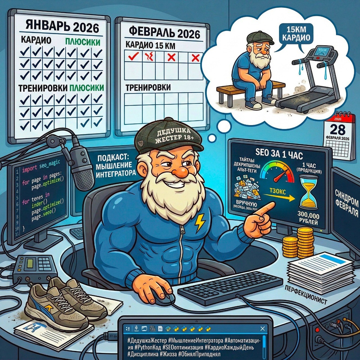 💻📉🏃♂️ Ребятушки, всем привет! Вот и настал последний день зимы — 28 февраля 2026 года. На улице уже пахнет весной, а мы подводим итоги этого напряженного месяца. В новом подкасте разбираем, куда делась дисциплина, как справляться со стрессом и почему Python — лучший друг интегратора. ✅ Забытый график и ловушка февраля. Признаюсь честно: я подзабил на свой график тренировок и кардио. Январь прошел идеально, а в феврале система дала сбой. Когда ты не отмечаешь плюсики (прогулки) на своем маркерном планшете-запоминайзере, дисциплина начинает хромать. Без кардио на 10-15 км в день накапливается стресс, и ты с головой уходишь в работу, забывая о себе. ✅ Автоматизация рутины. Зато в работе случился прорыв! То, что раньше ковырял месяцами, теперь закрываю за один-два дня. Секрет прост: я полностью перешел на автоматизацию. Пишу скрипты и код на Python, чтобы обрабатывать огромные массивы данных. ✅ Магия SEO на максималках. Как это работает на практике? Представьте: нужно оптимизироват