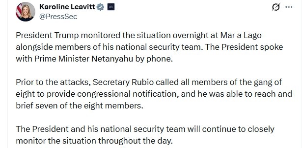 President and his national security team will continue to closely monitor the situation' — Karoline Leavitt