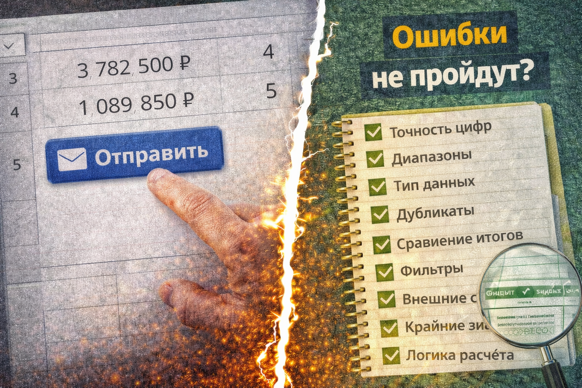 Проверь таблицу перед отправкой: 9 шагов, которые спасут от ошибки. Как проверить Excel-отчёт перед отправкой руководителю: контрольные формулы, поиск расхождений, проверка диапазонов, дубликатов и логики расчёта. Отчёт готов. Цифры сходятся. Палец завис над кнопкой “Отправить”. Именно в этот момент нужно остановиться. Ошибка в таблице — это не просто технический баг. Это удар по доверию. Разберём систему проверки, которая занимает 5–7 минут. Вы видите 10,2. Excel хранит 10,234. Перед проверкой увеличьте количество знаков после запятой. Если итоги меняются — это уже сигнал. Щёлкните по формуле. Выделяется ли весь диапазон данных? Если строк 100, а формула считает 99 — одна позиция выпала. Типичная формула: =СУММ(B2:B101). Проверьте, нет ли данных в B102. Одна текстовая цифра ломает расчёт. Проверка: =ЕЧИСЛО(B2). Если ЛОЖЬ — это текст. Особенно критично в финансовых отчётах. Один повтор — двойной результат. Проверка: =СЧЁТЕСЛИ(A:A;A2)>1 Если ИСТИНА — есть повтор. Сделайте параллельный