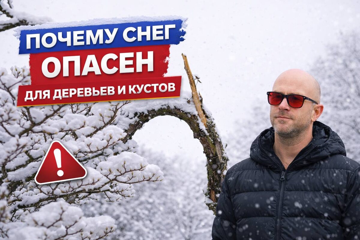 Вы выходите во двор после снегопада — красиво, тихо, белые шапки на яблонях, пушистые туи, смородина как в открытке. Жалко трогать. Кажется, снег укутал и защитил. А весной — перекошенная крона, подсохшая ветка, побуревшая хвоя. И непонятно, когда это произошло. Давайте вместе разберемся когда снег действительно опасен для кроны, как не пропустить скрытые зимние повреждения и что сделать весной, чтобы растения быстрее восстановились. Свежий сухой снег лёгкий и обычно безопасный. Но при температуре около нуля он напитывается водой, уплотняется и тяжелеет в несколько раз. Днём плюс, ночью минус — и на ветках уже не мягкий слой, а плотная корка. Больше всего страдают развилки у яблонь, длинные побеги смородины, декоративные формы, туи. И важный момент: нагрузка сильнее на концах ветвей, поэтому даже небольшой комок на краю может быть опаснее, чем большой слой ближе к стволу. Если ветви стоят в устойчивом прогибе — это уже сигнал. Мокрый липкий снег при нуле, снег, набившийся внутрь кус