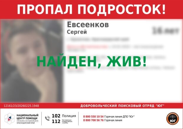 Воспитанник Кропоткинского детского дома‑интерната, который пропал четыре дня назад, вернулся в учреждение самостоятельно. Об этом сообщили представители добровольческого поискового отряда «Юг». Вечером 24 февраля подросток покинул интернат вместе с 17‑летним другом. Уже на следующий день, 25 февраля, второго беглеца обнаружили в станице Кавказской. Поиски первого юноши продолжались несколько дней — к ним подключились волонтёры поискового отряда, сотрудники полиции и представители местной администрации. По данным поисковиков, молодой человек найден живым — он сам вернулся в интернат спустя четыре дня.