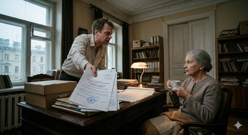 — Причем здесь чертежи! — он вдруг сорвался на крик, потрясая бумагами в воздухе. В его глазах плескались отчаяние и ярость. — Что это за договор?! «Соглашение о передаче прав собственности»? «Пожизненное содержание с иждивением»? Академия архитектурного наследия?! Вы... вы отписали эту квартиру Академии?! И весь архив тоже?!