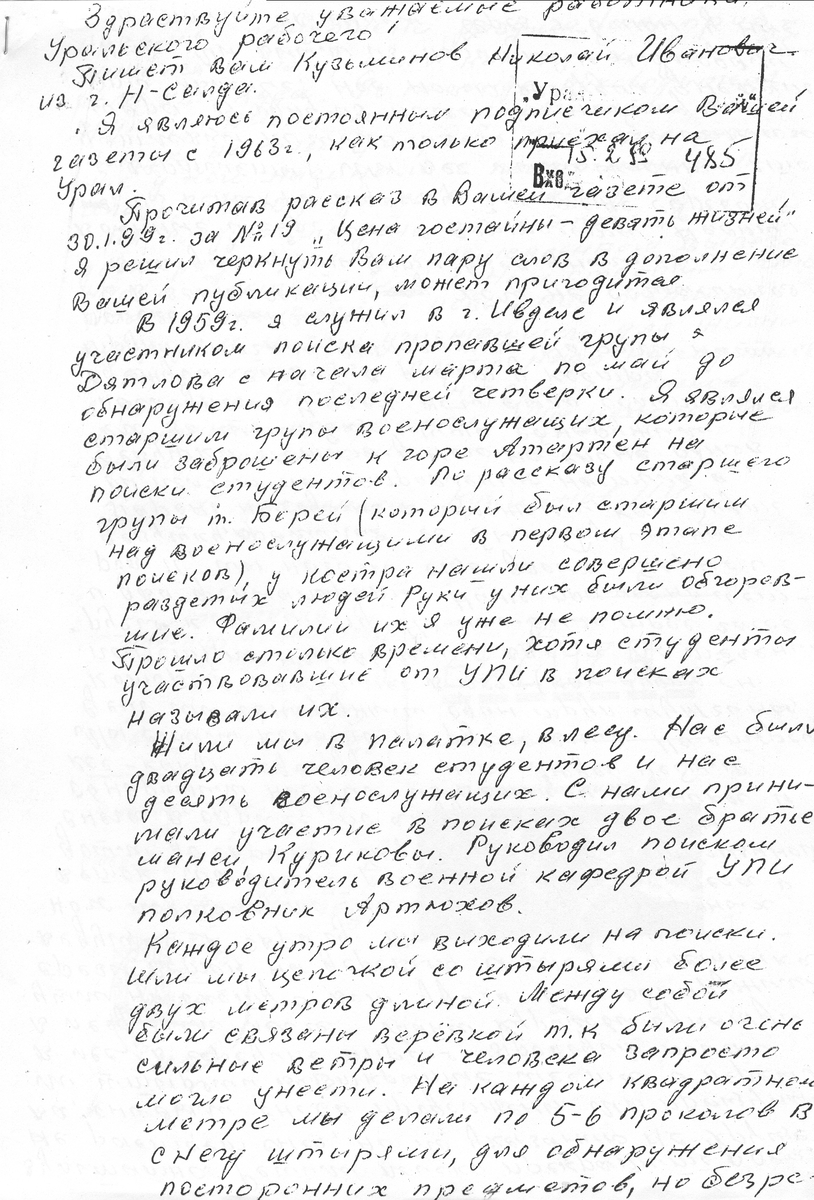 Первая часть по ссылке: https://dzen.ru/a/aZ82DJgnDXdYWrBm В 1999 г. в редакцию "Уральского рабочего" пришло письмо от жителя Верхней Салды, Николая Кузьминова. "Кузьминов был уверен, что причиной гибели группы стал контакт с так называемыми огненными шарами. Видимо, Кузьминов был уверен в том, что это были ракеты. С ним самим чуть не случилась такая же трагедия. Интересно, что никто, кроме Николая Ивановича, об этом случае не упоминает. Как-то они наблюдали такой шар. Их вызвал из палатки дневальный, который первым заметил его на ночном небе. Через 5-6 минут разум людей помутился, и они стали расходиться в разные стороны. Спасло их только то, что Кузьминов (по команде руководителя) стал стрелять в воздух из пистолета. После ЧП военнослужащие дали радиограмму с просьбой организовать их эвакуацию. Им ответили, что данное явление было связано с испытаниями (!) ракетного топлива на водороде. Явление не опасное, если в это время не выходить наружу из палатки. Солдатам пообещали, что испыта