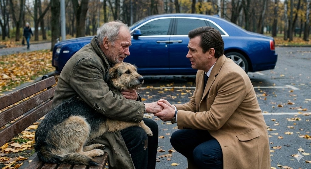 Он попытался встать, тяжело опираясь на деревянную спинку скамейки, но мужчина вдруг сделал шаг вперед. Он стянул с руки дорогую кожаную перчатку и, не обращая внимания на свой безупречный костюм, опустился прямо на одно колено на влажный, усыпанный листьями асфальт перед стариком.