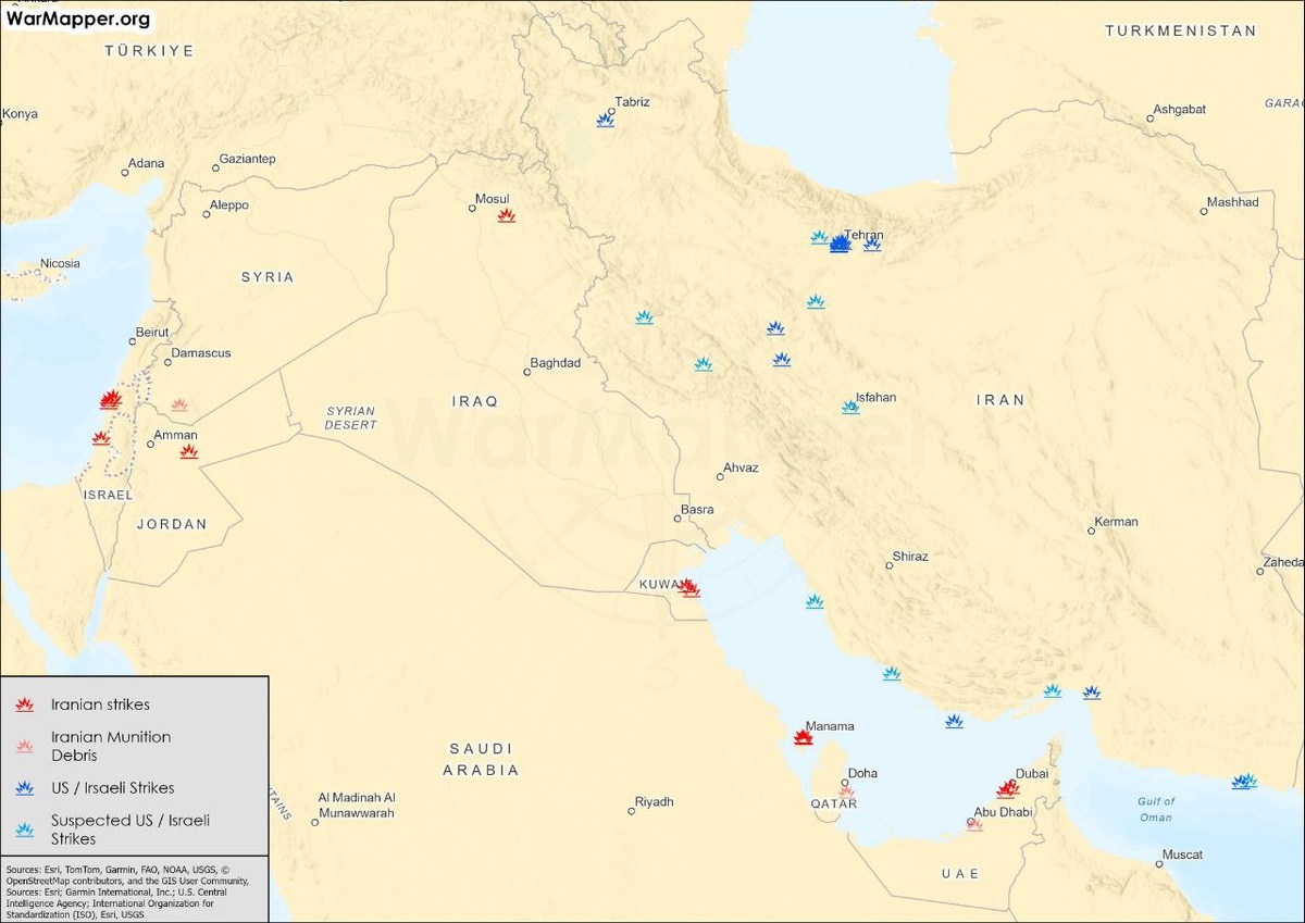 Предварительная карта ударов Израиля и США по Ирану, а также ударов Ирана по израильским и американским базам на Ближнем Востоке.