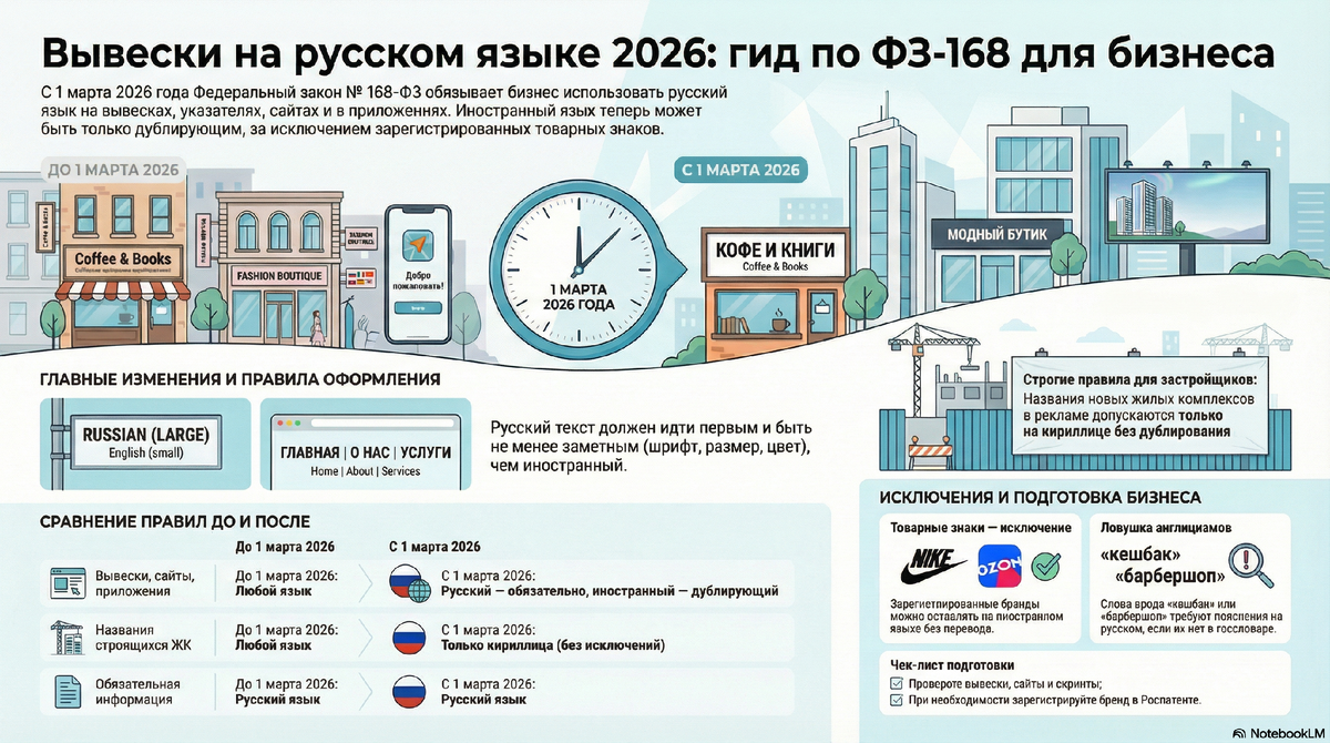 С 1 марта 2026 года вступает в силу Федеральный закон № 168-ФЗ, который радикально меняет облик российских городов. Если раньше предприниматели могли безнаказанно использовать латиницу для привлечения внимания, то теперь государственным приоритетом становится защита права граждан на информацию на родном языке. Реформа охватывает не только фасадные таблички. Под новые правила попадает любая информация, направленная на потребителя. Это означает, что «цифровая витрина» приравнивается к реальной. Закон оставляет лазейку для тех, кто не готов расставаться с западным стилем. Латиница разрешена в двух случаях: Важно для малого бизнеса: Индивидуальные предприниматели лишены права на «фирменное наименование». Для них единственный законный способ сохранить английское название на вывеске — это регистрация товарного знака в Роспатенте. Учитывая, что процедура длится около года, подавать документы нужно уже сейчас. Если вы используете иностранное слово (не являющееся брендом), его обязан сопровожда