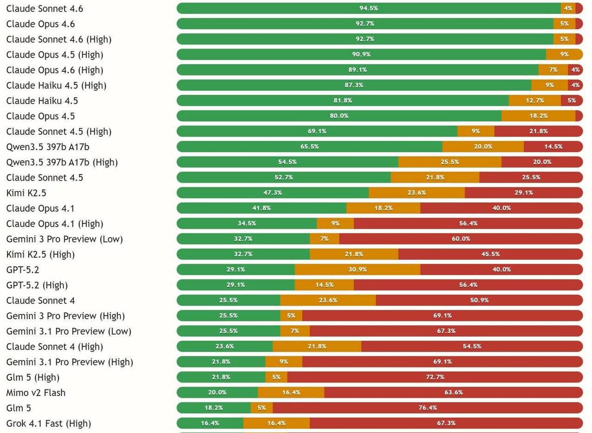 Появился бенчмарк почти с 30 ИИ-моделями, которым специально отправляли неверные и абсурдные утверждения, чтобы проверить, будут ли они исправлять пользователя или просто соглашаться. Красный – модель соглашается без проверки; Жёлтый – выражает сомнения, но не настаивает; Зелёный – указывает на ошибку и объясняет, почему утверждение неверно. Среди самых устойчивых чаще отмечают модели Claude от Anthropic, а более склонной к согласию Grok от xAI. Technogram Inside
