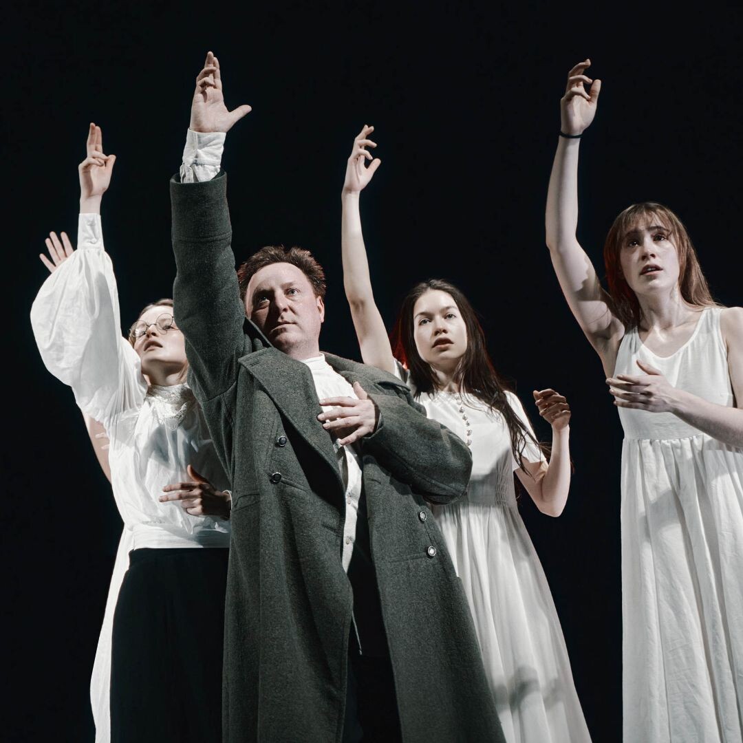 "Капитанская дочка" своей театральной эстетикой мне очень напомнила другой спектакль Олега Долина "Ионыч". Такая же минималистичная сценография, что совершенно не странно: и там и там - работа Максима Обрезкова. В постановке Вахтанговского театра есть два персонажа: Графиня из романа и Художник из романа, которые по словам актрисы, воплощающей роль Графини, играют "...роль рока, судьбы, которые довлеют над всей этой очень сложной чеховской историей. Это такая красная нить, которая проходит через весь спектакль". В спектакле Пушкинского театра эту роль выполняет Терпсихора, муза танца и эпической поэзии (Евгения Леонова). Всклоченные волосы, платье в кровавых отпечатках рук и с подолом, который выпачкан кровью.