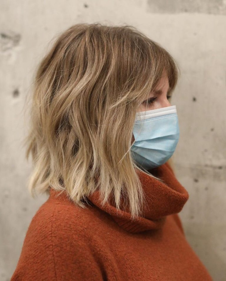 Средняя стрижка с чёлкой заиграет новыми красками (буквально), если добавить бликов. Однотонный темный цвет после 40 может накинуть пару лет и подчеркнуть усталость. Попросите мастера сделать «шатуш» или «эйртач». Светлые пряди у лица работают как хайлайтер — подсвечивают кожу и освежают вид.