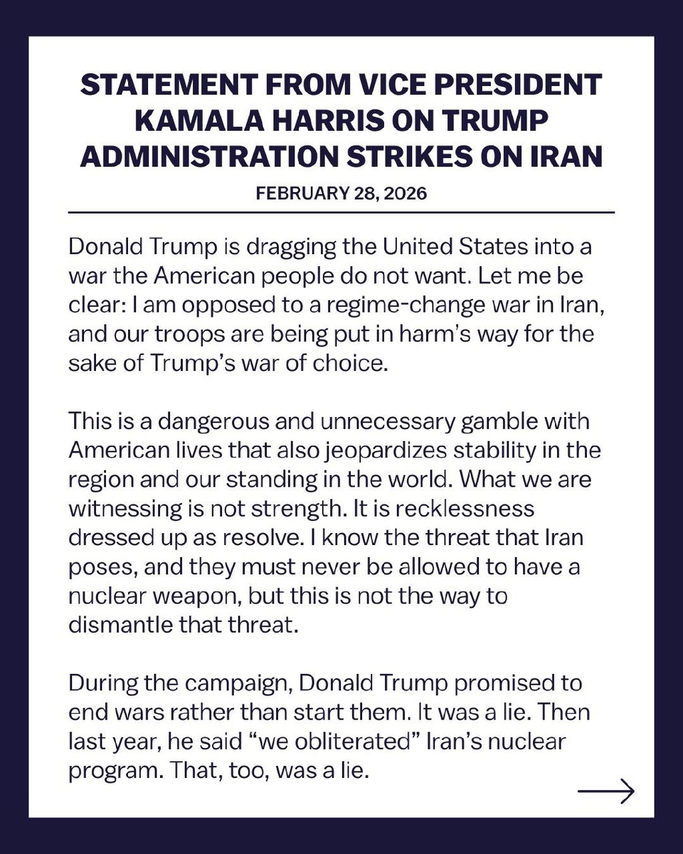 KAMALA HARRIS: ‘Donald Trump is dragging the United States into a war the American people do not want… I am opposed to a regime-change war in Iran’