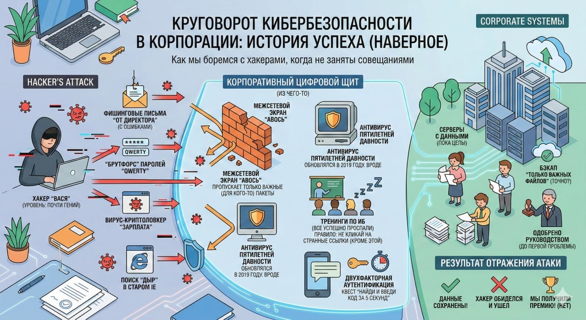 Промпт: "A flat lay infographic of cybersecurity deflecting the hacker's attack in corporation. Все надписи на русском языке с иронией." Моя работа, только сделал. Кликабельно. Как вам? Развлекуха, факт. Но можно и более прикладные истории придумать... Русский ИТ бизнес +✅Мы в MAX