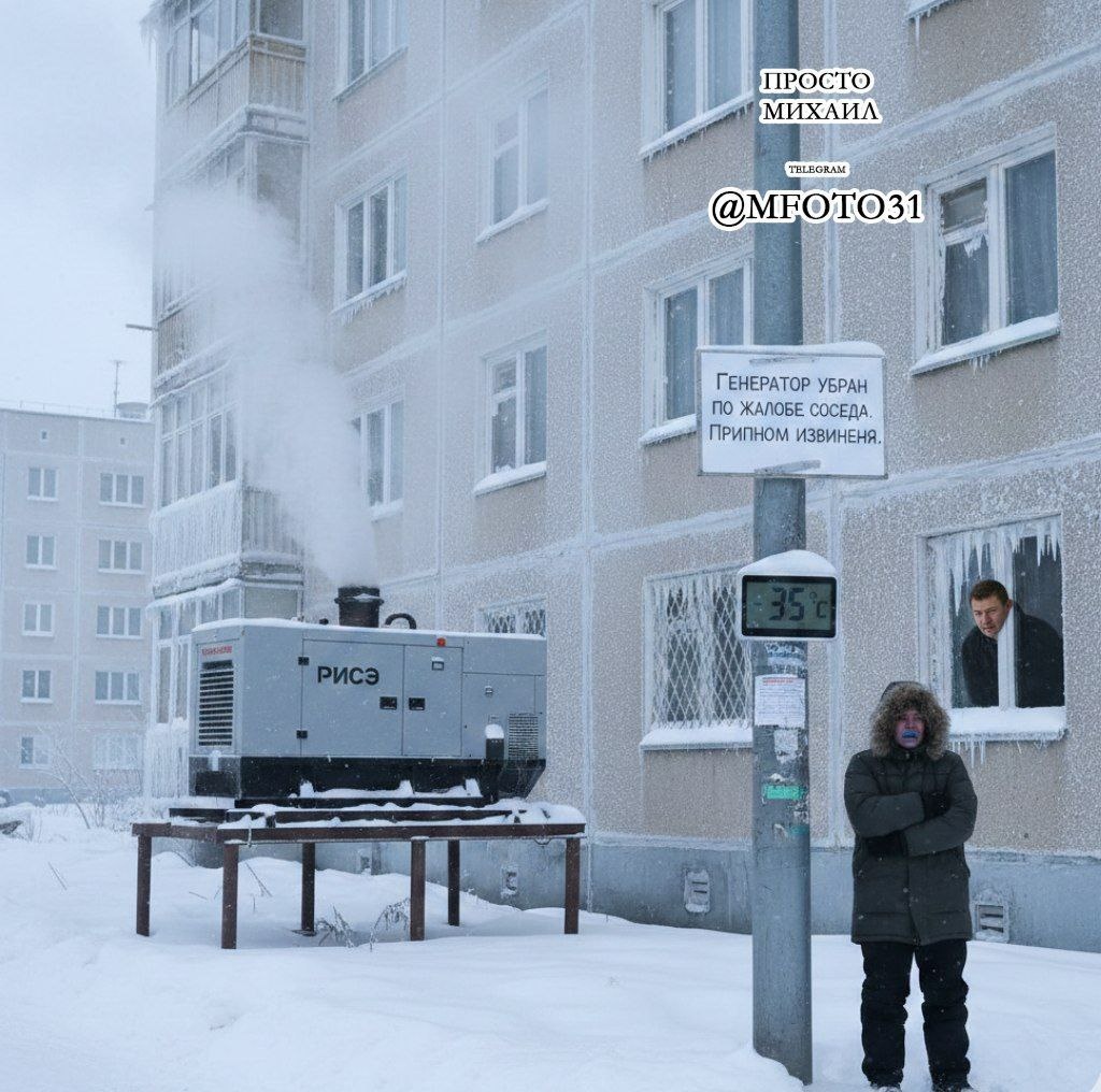 Но один житель пожаловался на шум и выхлопы — генератор убрали. А спустя время ударил сильный мороз... Но есть и другая сторона: большинство жителей выходило из домов к людям, которые, несмотря ни на что, подключали генераторы, и предлагали им чай и посильную помощь Рисунок ИИ вШбк 🇷🇺 Шебекино | Наша группа ВК