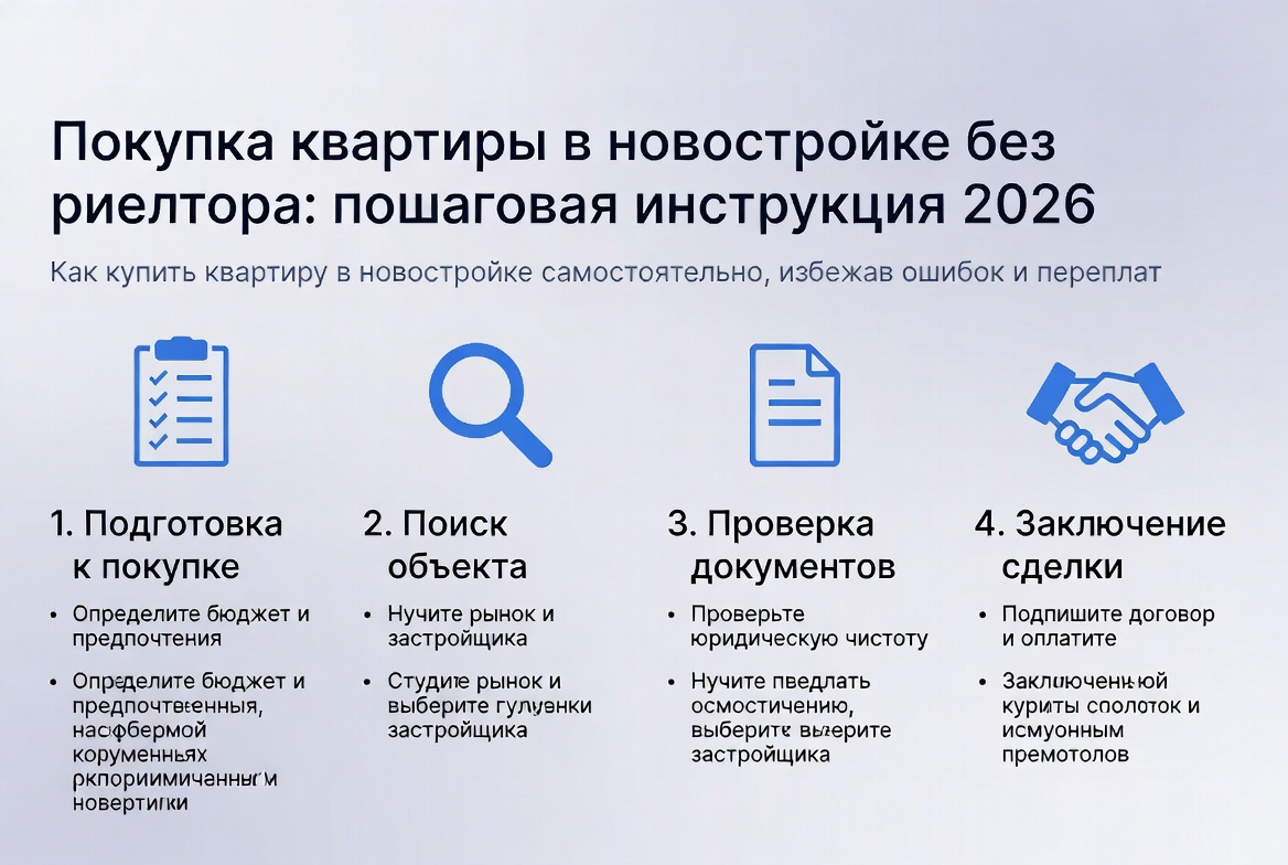 - Покупка квартиры в новостройке без риелтора возможна и экономит 2–5% от стоимости жилья. Вам нужно самостоятельно выбрать застройщика, проверить документы, подписать ДДУ и оформить собственность. Главное — знать пошаговый процесс и не пропускать важные этапы проверки.