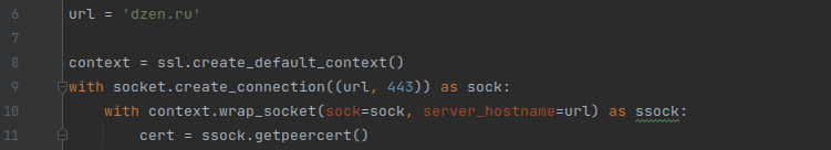 socket.create_connection((url, 443)) # Получение данных о сертификате домена
