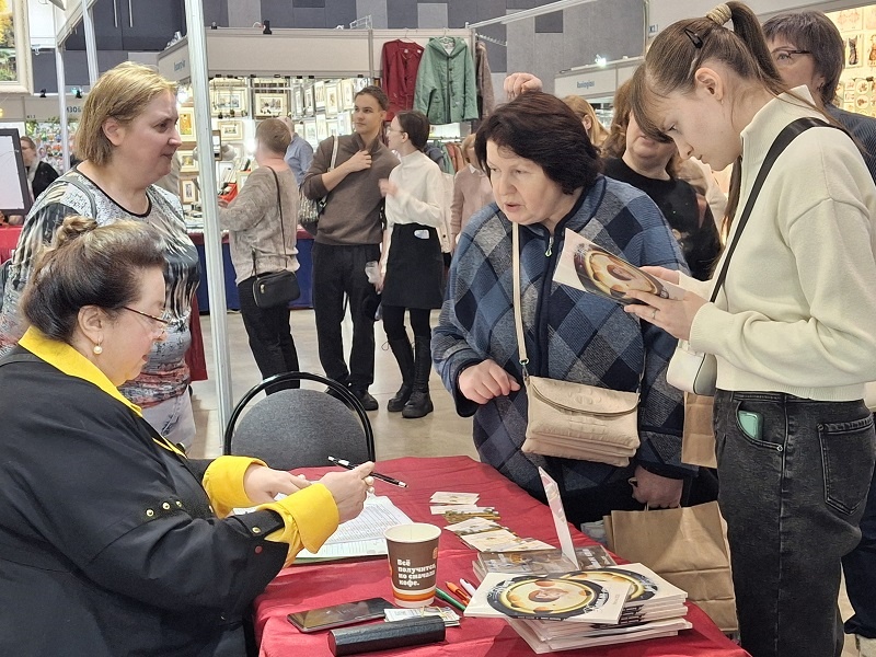 Да-да! Сегодня обычный, нормальный, как в лучшие времена, полезный выставочный день, наполненный работой и приятными встречами! С утра пришла замечательная семейная пара, где супруг очень поддерживает и восхищается увлечением супруги, помогает выбирать дизайны для следующей вышивки и очень гордится своей женой! Его зовут Максим, и интервью с ним вы увидите в нашем ролике. А вот как зовут супругу мы спросить забыли … А жаль! Потому что она принесла показать нам свои готовые работы: Девочку с собачкой и Яблоки на столе. Девочка собирается в багетку, а яблоки мы сначала должны подсчитать урожай! Это Яблоки на 18ct и у них вполне хороший, съедобный размер. Но можно и покрупнее, поэтому не бойтесь даже 16ct. ... У Веры сегодня "событие"! (она сама так сказала - она купила первую ЭстЭ!