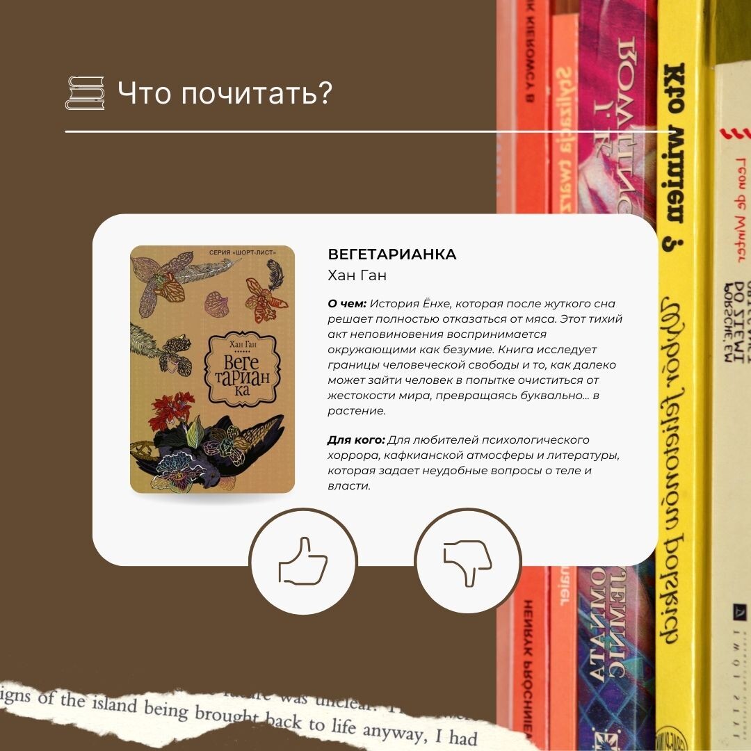 В западном мире это бы никого не удивило, но в консервативном корейском обществе такой поступок становится актом открытой агрессии. Книга Хан Ган «Вегетарианка» — это мощная драма о том, как одна маленькая перемена в человеке может вызвать эффект домино и разрушить жизни всех окружающих.