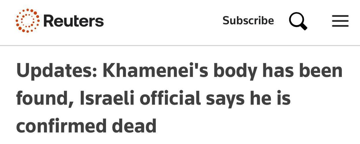 Как сообщает Reuters со ссылкой на высокопоставленного израильского чиновника, тело Хаменеи уже обнаружено. Аналогичную информацию распространяют и израильские СМИ. 🤗 НАСОНОВ ▶️