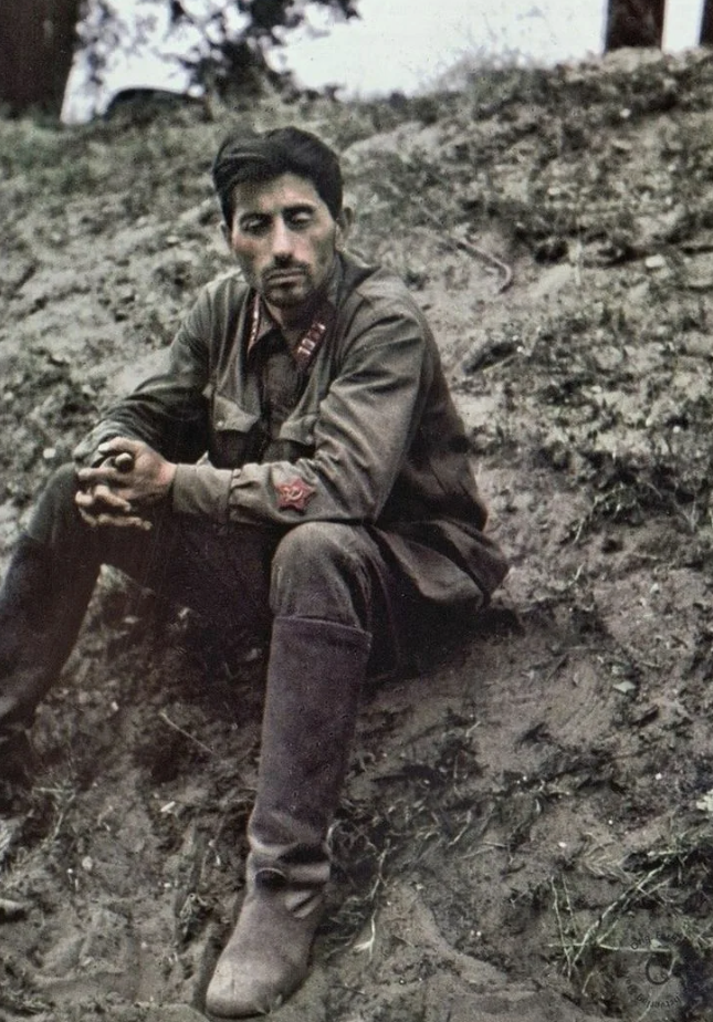 Фотография, о которой пойдёт речь, стала доступна широкой публике только в 2015 году — после публикации в Германии записей Германа Турка. Военный врач 3‑й танковой дивизии вермахта сохранил снимок, благодаря которому удалось установить личность прежде неизвестного полкового комиссара — Мириана Левановича Одишарии. Его пленили 1 августа 1941 года. Первые месяцы Великой Отечественной стали суровым испытанием для 148‑й стрелковой дивизии, где служил Одишария. На конец июля 1941‑го соединение понесло тяжёлые потери: оно лишилось больше половины личного состава, вынуждено было действовать разрозненными группами и неоднократно выбираться из вражеского окружения. Но красноармейцы, от командира до повара, продолжали отчаянно сдерживать натиск противника. При подготовке материала мне не удалось обнаружить записей боевого журнала дивизии, датированных ранее 19 ноября 1941 года. Примечательно, что именно тогда соединение завершило переформирование и фактически начало новый этап своего боевого пут