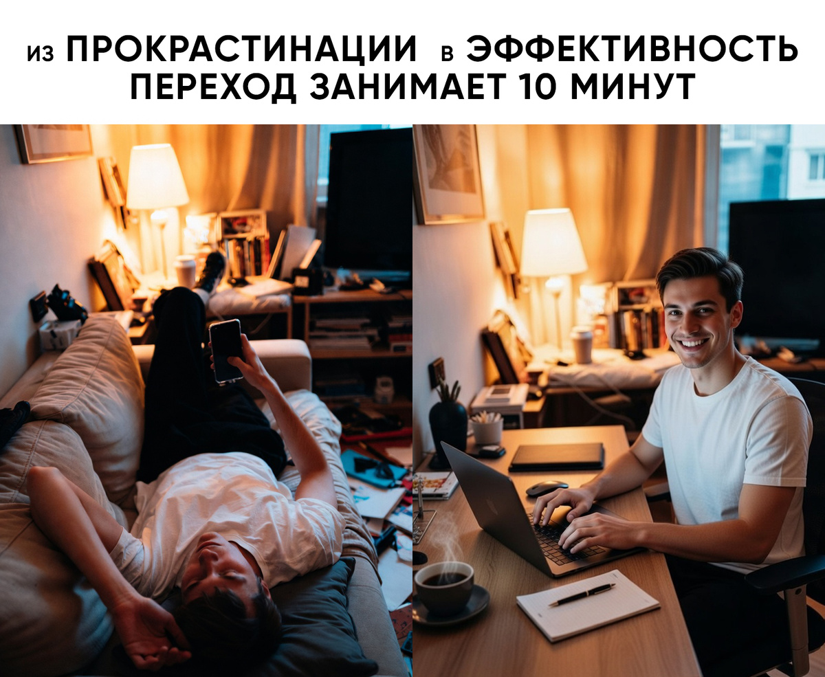 №Что должно быть на картинкеПочему это работает1Проблема. Человек в позе прокрастинации: лежит на диване с телефоном, вокруг хаос, на лице выражение вины и апатии.Триггер боли — каждый узнаёт себя в моменте "ничего не делаю, но мучаюсь".2Решение. Таймер на 10 минут, рядом человек бодро работает за столом или занимается делом.Показывает, что решение простое и доступное.