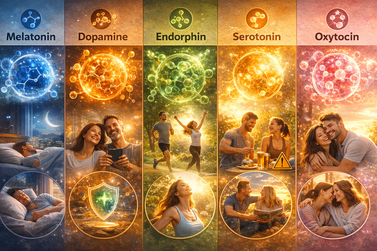 Наше настроение и самочувствие во многом зависят от химических веществ, которые вырабатывает организм. Эти гормоны не только делают нас счастливыми, но и поддерживают здоровье, иммунитет и даже замедляют старение. Разберём ключевых «игроков» нашего внутреннего счастья. Мелатонин известен как «гормон сна». Он вырабатывается только ночью, когда мы погружаемся в темноту. Но его функции выходят далеко за пределы регулирования сна: 💡 Вывод: полноценный ночной сон критически важен для здоровья, ведь только ночью организм способен вырабатывать достаточный уровень мелатонина. Дофамин называют «гормоном удовольствия», потому что он: Его выработка усиливается при: ⚠️ Но будьте осторожны: алкоголь также временно повышает уровень дофамина, однако сопровождается разрушительными последствиями для здоровья. Эндорфин — это естественное обезболивающее организма. Его выработка активируется: Регулярные нагрузки помогают не только держать тело в форме, но и поддерживать стабильное позитивное настроение.