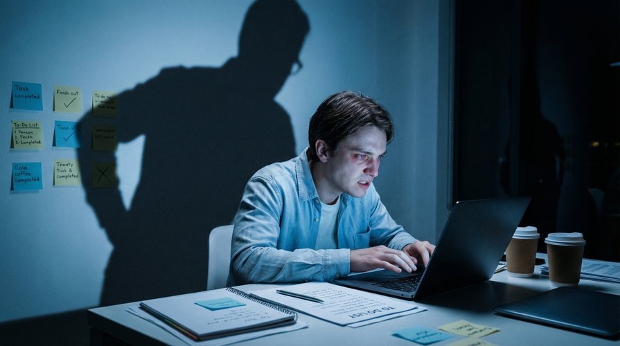Завтра утром совещание. Презентация готова — и она хорошая. Вы это знаете. Коллеги сказали бы: «Отлично, иди спать». Но вы сидите перед экраном, меняете шрифт на третьем слайде, переписываете формулировку, которую никто не заметит, выравниваете отступы. Между лопатками — каменная плита. Челюсть стиснута так, что ноют зубы.