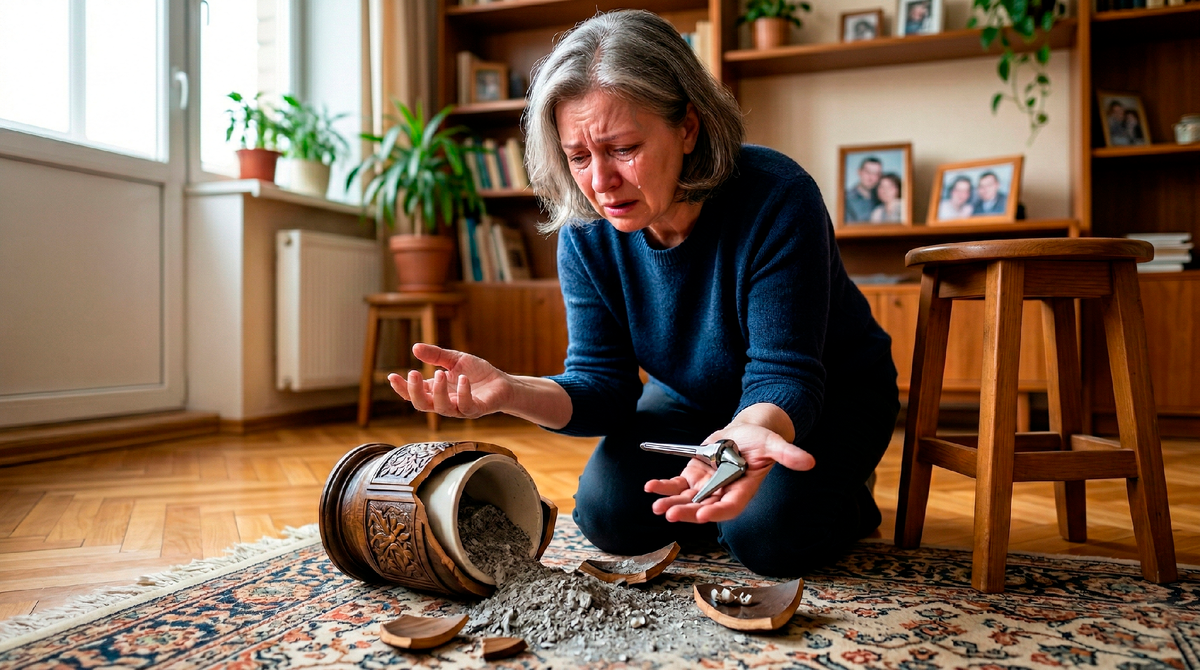 Катастрофа произошла в обычную субботу. Нина Валерьевна затеяла генеральную уборку. Она протирала пыль с верхних полок шведского стеллажа, стоя на старой деревянной табуретке. Ножка табуретки, давно расшатанная, вдруг скрипнула и подломилась. Нина Валерьевна резко взмахнула руками, пытаясь удержать равновесие, ее пальцы вцепились в край полки, смахнув тяжелую дубовую урну.
