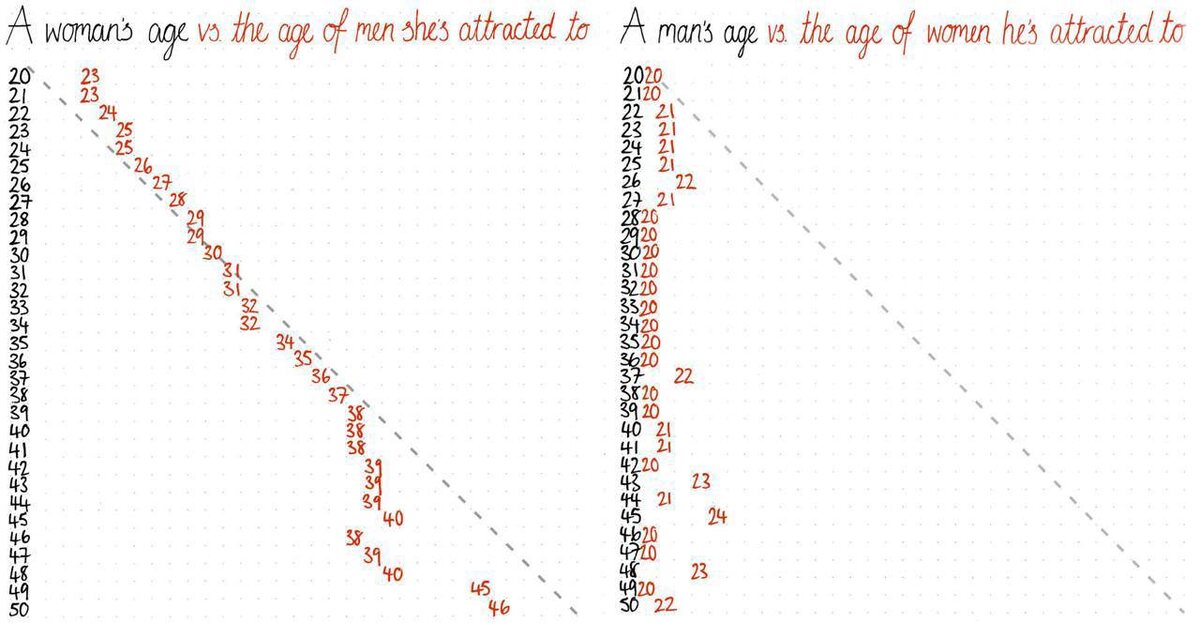 Вниз увеличивается возраст человека, а красным отображен возраст партнера, который респондент считают самым привлекательным. Слева женщины, справа мужчины. Какие мужики стабильные 😁 👉 @yug_moto #мотопара #югмото