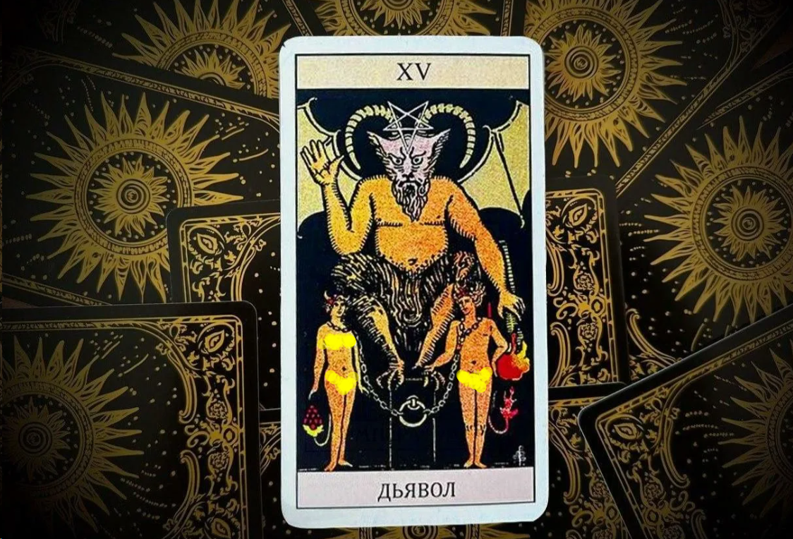 Чтобы расшифровать послание карты, обратимся к классическому образу, созданному Артуром Уэйтом. На карте мы видим рогатое существо на троне, к которому цепями прикованы мужчина и женщина.