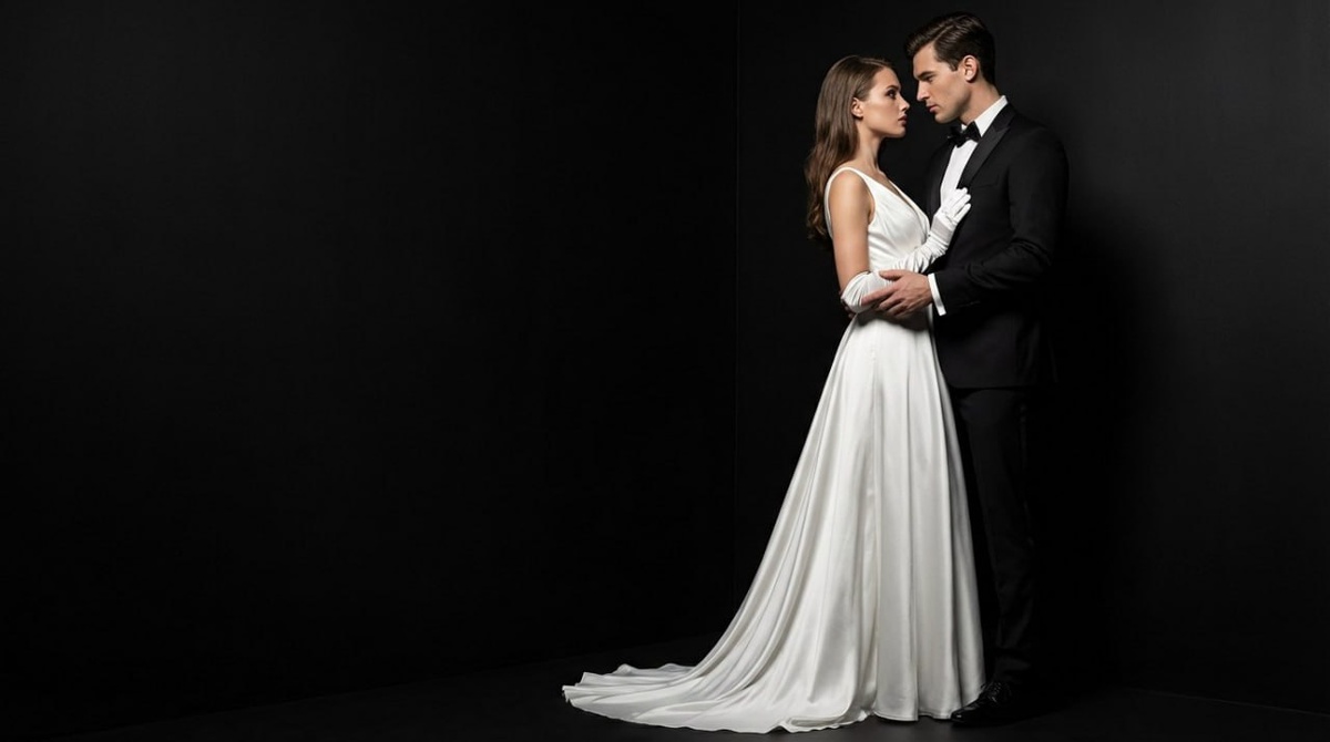 Парные образы и взаимодействие моделей Итак, время экспериментов с дуэтами. В моде ИИ одиночные кадры — это база, но настоящая магия начинается, когда в кадре появляется взаимодействие. Химия между моделями, контраст или единство стилей, взгляды друг на друга или отстраненность — всё это создает историю. Сегодня учимся снимать парные образы: женские, мужские и смешанные пары. Промпты ниже — каркасы для построения дуэтов. Добавляйте к ним конкретную одежду, типажи и фон, но главное — не забывайте прописывать связь между персонажами. 🔑 Ключ (Prompt): Вариант 1. Смешанная пара (контраст черного и белого, взаимодействие взглядов): A fashion couple, male and female models, standing close together, she in a flowing white silk gown, he in a sharp black tailored tuxedo. They are looking at each other with intense chemistry, her hand gently on his chest. Studio photography, dramatic lighting, black background, high contrast, editorial style. *(Модная пара, мужская и женская модели, стоят бл