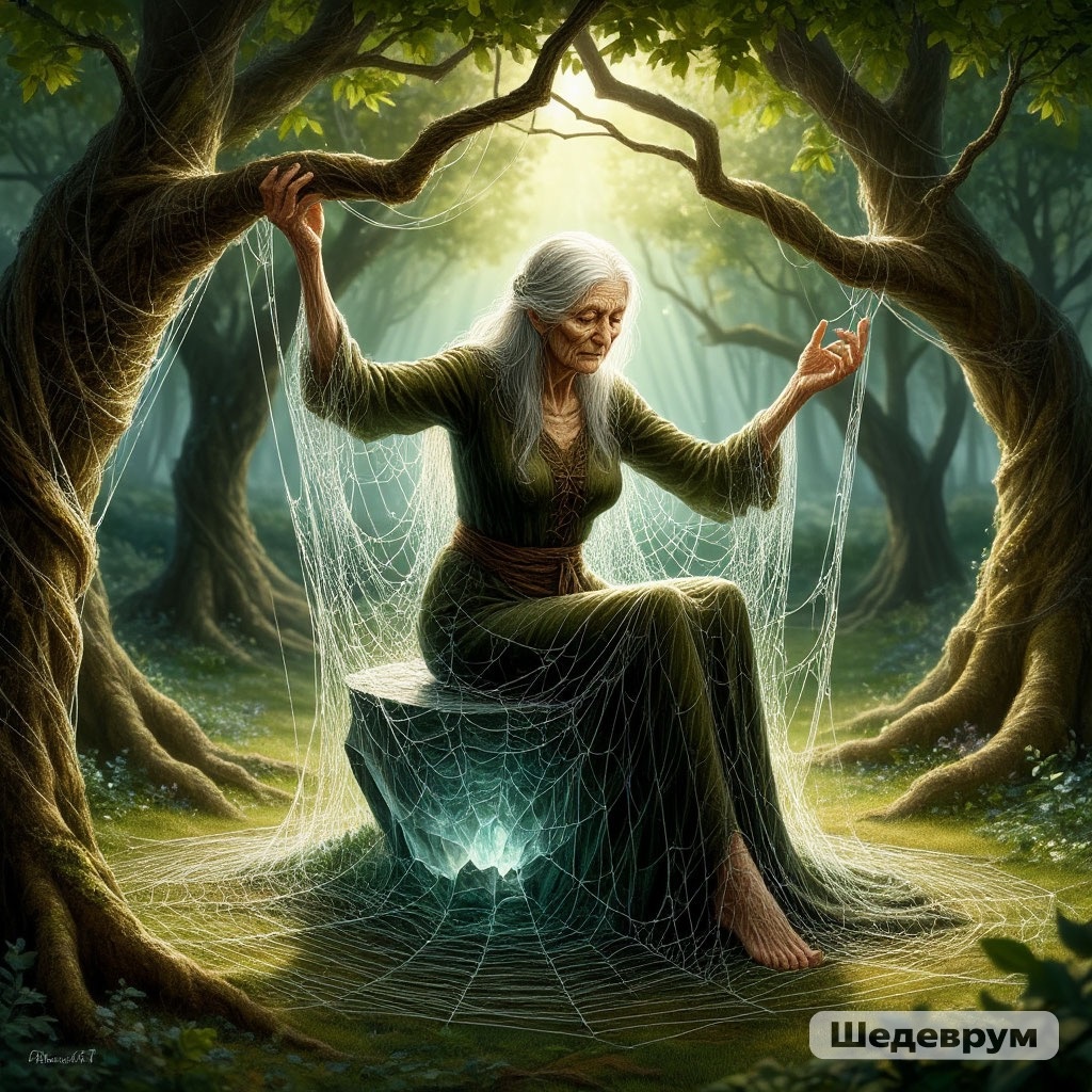 В самом центре Сада, там, где переплетаются тени от всех Деревьев-Дилемм, сидит на хрустальном коконе Старуха-Паучиха. Она не плетёт паутину, чтобы ловить. Она ткёт Полотно Случайностей.