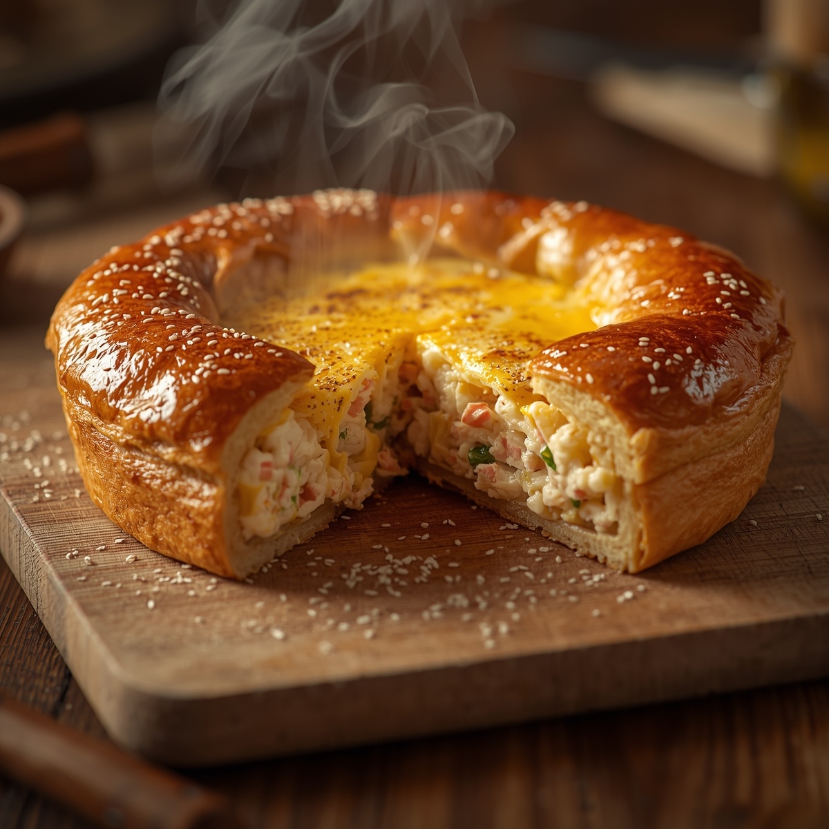 Нежное слоёное тесто, сочная крабовая начинка, расплавленный сыр — что может быть лучше? Этот пирог точно станет вашим коронным блюдом.