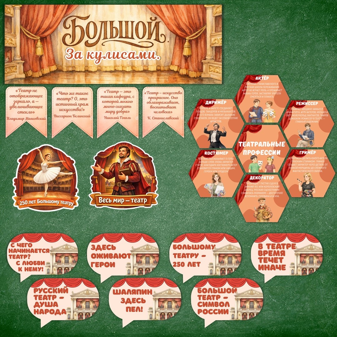Оформление «Большой. За кулисами. 250 лет Большому театру и 150 лет Союзу театральных деятелей России» для «Разговоров о важном». В набор для оформления входит: Это яркое и информативное оформление поможет рассказать школьникам о богатой истории русского театра, подчеркнуть его важность и достичь интереса к театральному искусству. В процессе печати есть возможность настроить размер материалов под ваши нужды, чтобы максимально гармонично вписать их в пространство. Файл в PDF-формате на листах А4. В процессе печати можно настроить необходимый размер материалов согласно вашим предпочтениям и потребностям пространства кабинета.