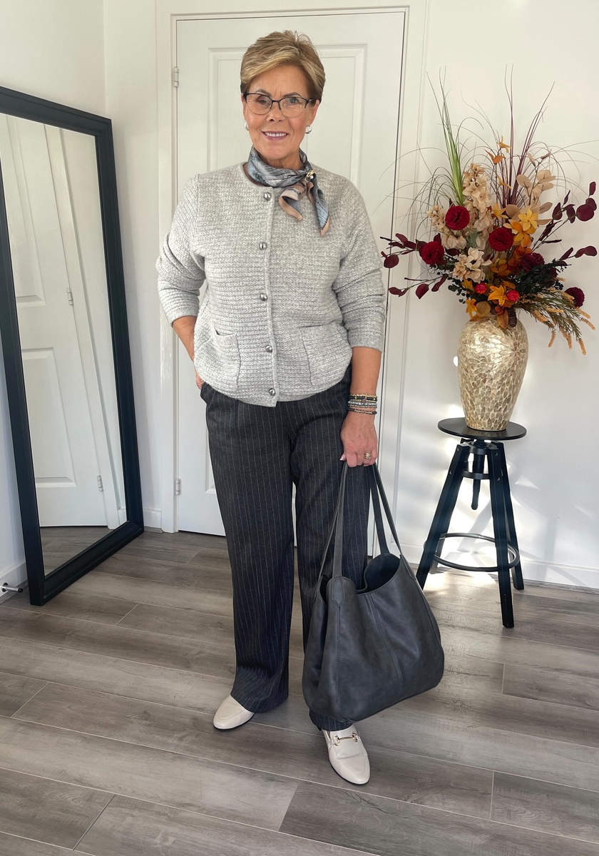 Для женщин элегантного возраста 50-60+ брюки - настоящая находка, позволяющая создавать комфортные, но при этом невероятно стильные образы. Современная мода предлагает множество фасонов, которые подчеркнут индивидуальность и добавят уверенности. Давайте разберем несколько беспроигрышных комбинаций, которые помогут вам выглядеть безупречно этой весной. Мелкая полоска на брюках визуально вытягивает силуэт, короткий серый кардиган придает мягкости и текстуру в образ. Шелковый платок добавляет образу изысканности и цветовой акцент, делая его более женственным и завершенным. Этот образ - идеальный вариант для работающих пенсионерок или тех, кто ведет активный образ жизни и ценит элегантность. Приталенный жакет гармонирует с серыми брюками и прекрасно подчеркивает фигуру. Блузка с высоким воротом добавляет строгости и изысканности. Гармоничное сочетание теплых тонов создает уютный и солнечный весенний образ. Желтый кардиган оживляет темные брюки, а монохромные аксессуары делают комплект
