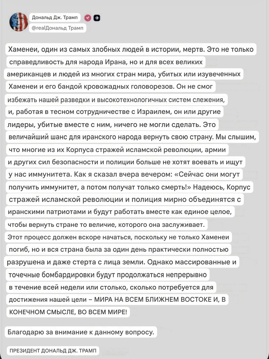 💬 Дональд Трамп с гордостью объявил о том, что Израиль и США уничтожили Аятоллу Хаменеи.